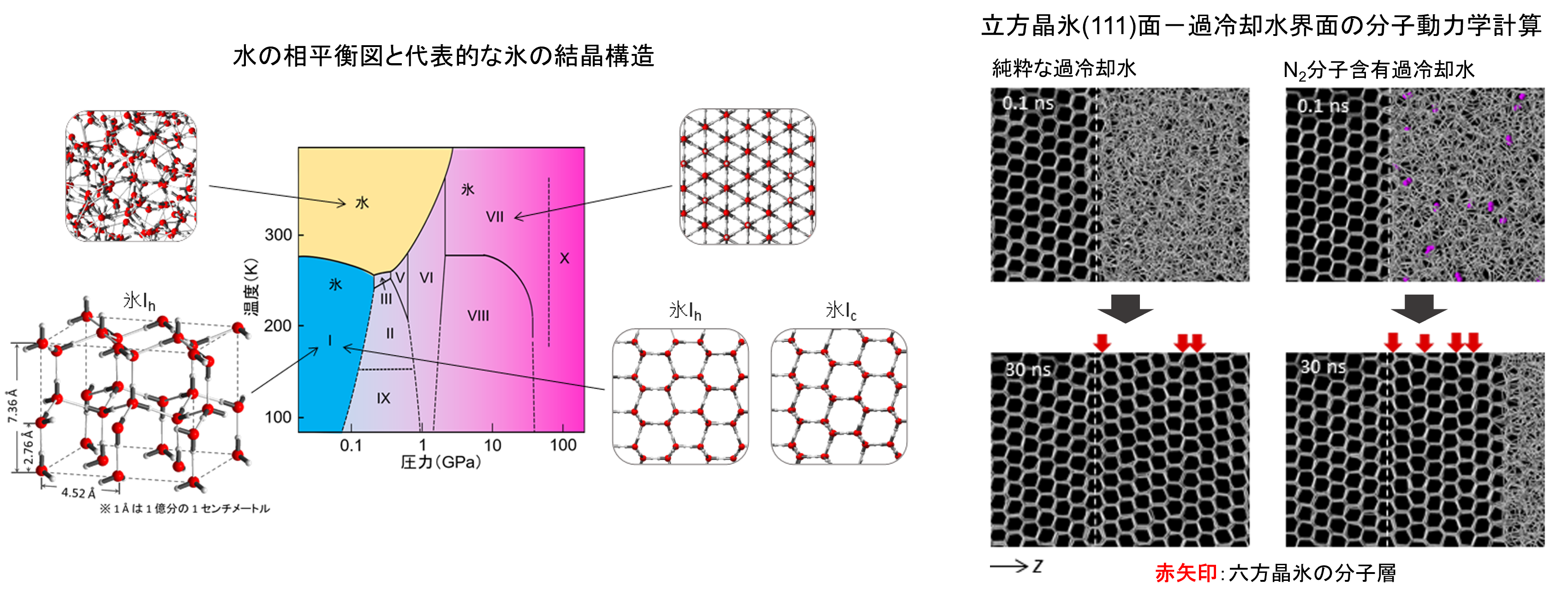当研究室は、通常我々が目にする六方晶氷(Hexagonal Ice)、準安定相の立方晶氷(Cubic Ice)や高圧氷(High Pressure Ice)、包接水和物(Clathrate Hydrates)などの表面・界面構造や結晶成長機構を、分子動力学法などを使って国内外の実験グループと協力しながら調べています。これまでの研究で、六方晶氷の表面・界面構造や結晶成長機構の異方性を分子レベルで明らかにし、氷結晶や雪結晶の形の理解などに貢献してきました。また、高圧氷VIの界面構造と結晶成長機構の異方性の圧力依存性も分子レベルで明らかにし、実験観察される加圧時の氷VI成長形の劇的な変化のメカニズム解明に貢献してきました。最近、大気中氷晶の構造や成長速度が空気など大気中の物質分子により受ける影響の研究も開始しました。また、代表的な鉱物である炭酸カルシウム(Calcium Carbonate)を例に、その結晶核生成メカニズムに関する研究も行っています。